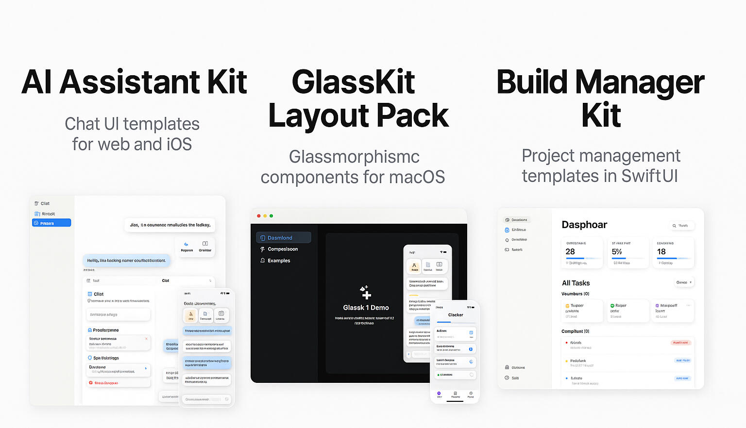 Xcode Swift TemplatesWhether you're creating an AI-powered tool, designing with modern Glassmorphism, or building a robust construction project manager, our templates give you a head start.AI Assistant Kit – Multiplatform chat app starter with file uploads, API key storage, and personality switching.GlassKit Layout Pack – Stunning glass-style UI components and layouts for macOS + iOS.BuildManagerKit – Complete construction management starter app with projects, tasks, workers, and schedule views.All templates are pure SwiftUI, multiplatform, dark mode ready, and easy to customize — so you can focus on your ideas, not boilerplate code.Click the Link to Visit our Store Page on Gumroad